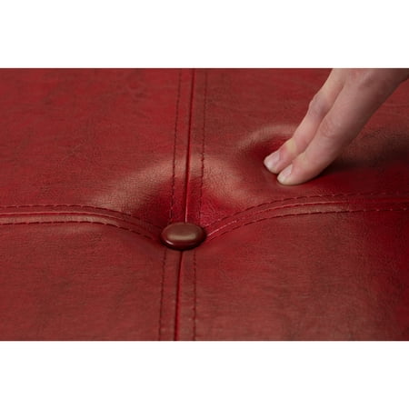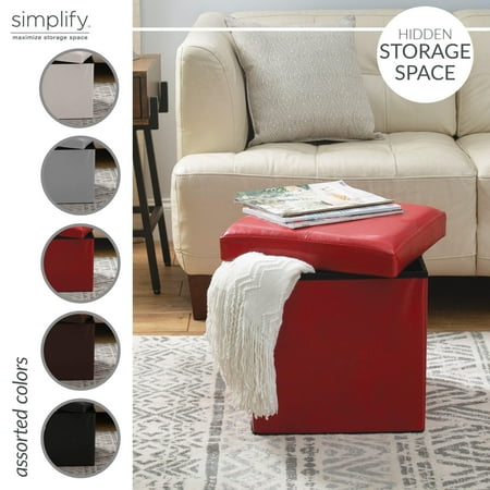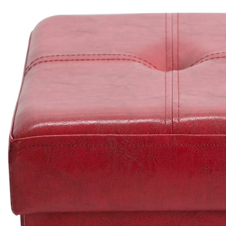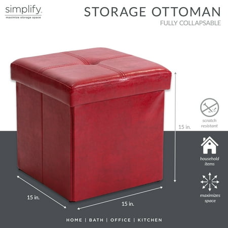 The Simplify Faux Leather Folding Storage Ottoman Cube in Red is the perfect addition to any household. Easily constructed the ottoman serves as storage, a footrest, additional seating and more! The cushioned top makes it comfortable to rest your feet or sit on. The hidden storage is perfect to store away those items you don't want laying around. When not in use the ottoman can be folded and put away.