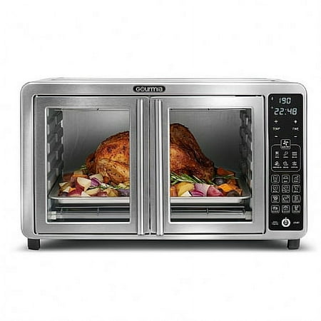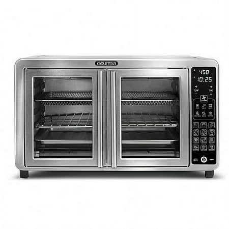 Gourmia’s XL Digital Air Fryer Oven cooks an impressive variety of foods: fries, bagels, pizza, popcorn, wings, seafood, and more. Give one door handle a pull, and both doors will open to welcome your trays of treats. Invite all your friends for a tasty, oil-free meal prepared in this XL air fryer that produces the best of balance: crispy on the outside and moist on the inside. Bon appetit! Fry Force 360° Technology cooks food quickly and evenly with little to no oil Popcorn function pops fresh popcorn without mess or oil Dehydrate function prepares healthy dried snacks such as beef jerky and apple chips Intuitive touchscreen makes it easy to set your preferences Display shows temperature and time simultaneously so it’s easy to adjust and monitor Stylish French doors open with a single pull, so you always have a free hand available Large, clear windows allow for easy monitoring of food while maintaining ideal oven temperature Designed with stainless steel for a sleek look and long-lasting durability Includes free download of 64-page recipe book created by Gourmia’s in-house chefs Includes Air fry basket, Oven rack, Baking pan, Crumb tray, User manual