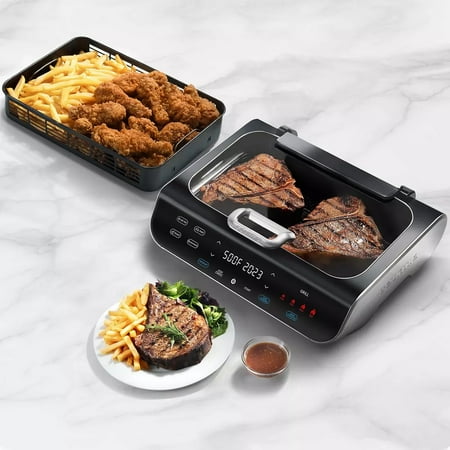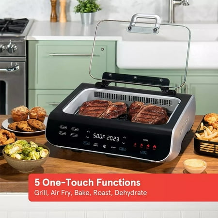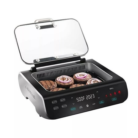 Gourmia FoodStation 5-in-1 Smokeless Grill & Air Fryer with Smoke-Extracting Technology Product Features: 5-in-1 foodstation grills, air fries, roasts, bakes and dehydrates 510° of direct heat to grill grate produces authentic BBQ results Smoke Extracting Technology provides an indoor grilling experience with virtually no smoke FryForce 360° Technology circulates powerful hot air that fries without oil, eliminating up to 80% of fat Extra-large capacity with a 14" x 9.5" grill grate and a 6 qt. air fry basket Designed with an intuitive touchscreen interface for choosing cooking method, temperature and time settings Guided Cooking offers optional preheat and turn food reminder, with visual and audible prompts Includes recipe book with cooking cheat sheets created by in-house chefs exclusively for the Gourmia FoodStation Removable grill grate, air fry basket, and drip tray are all nonstick and dishwasher safe Includes nonstick grill grate, nonstick air fry basket, removable drip tray, drip tray cover, recipe book and user manual