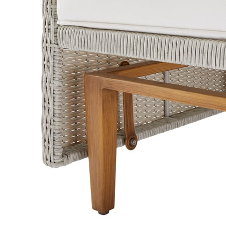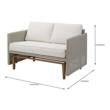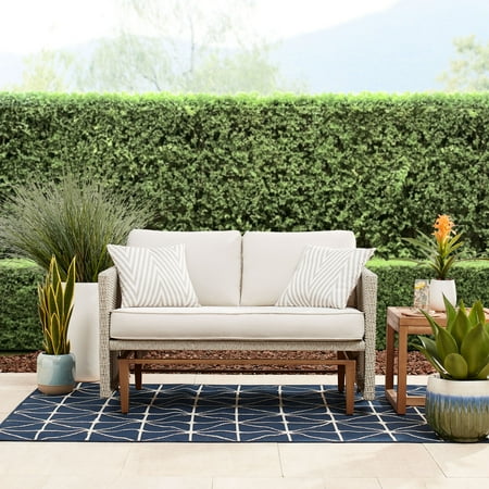 Relax on your patio or deck withthe Better Homes & GardensDavenport Outdoor LoveseatGlider Bench. The sturdysteel construction with powder-coated finish and all weather wickerensures durability and long-lastinguse. This outdoor garden glider willadd a beautiful presence to yourexisting space. It comes with fourcushions that are UV protected to retaintheir sharp color for seasons tocome. Add style and function toyour outdoor living space whileadding a relaxing place to sit, read,entertain and unwind, with thispatio glider bench.
