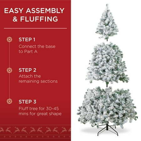 Bring a touch of winter to your living room this holiday season! These trees feature a thick snow-flocking with pre-strung lights on hundreds of PVC branches. This tree features a simple 3 step assembly: step 1 connect the base to part A, step 2 attach the remaining sections, step 3 fluff the tree for 30-45 mins for great shape! The cheer of a white Christmas is just a quick set up away, and thanks to the durable PVC branches, storage and maintenance are a breeze!