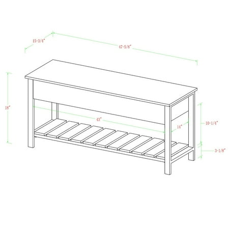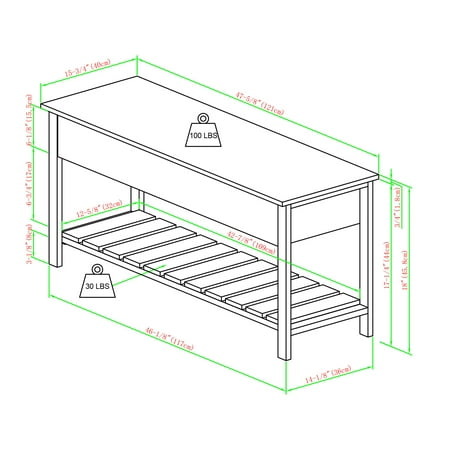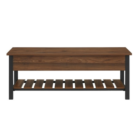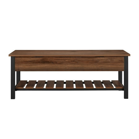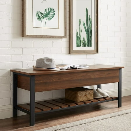 48" Modern Farmhouse Storage Bench - Dark Walnut Both beautiful and functional, this storage bench with a modern farmhouse flair will invigorate your home’s entryway or hallway. Made of high-grade MDF, premium laminate, and powder coated metal, the rustic design of this unit emulates a city park bench. Open the top of the bench to access interior storage. Use the bottom slatted shelf as a shoe rack. This wood and metal bench comfortably seats two adults. Slatted bottom shelf for shoes Top opens for more storage Mixed material park bench Made from warp-resistant MDF Use in entryway, mudroom, or bedrooms Ships ready-to-assemble with step-by-step instructions - Product Width (Depth): 16 - Product Weight: 54 - Product Length: 48 - Material: High-Grade MDF, Powder Coated Metal, Durable Laminate - Product Height: 18 - Color: Dark Walnut - Product Dimensions: 18" H x 48" L x 16" W 54LBS