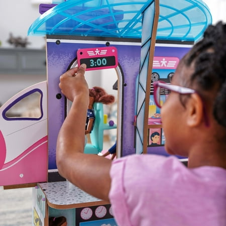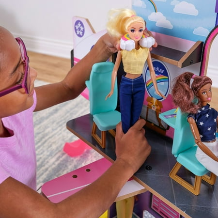 Travel in style with the KidKraft Luxe Life 2-in-1 Wooden Airport and Jet Plane Doll Play Set. This wooden play set provides a unique site for dolls to act out their travel adventures. All aspects of plane travel are represented, and with the spinning base, it's easy to go between the two sides. On one side, discover the airport for dolls, and on the other side, you'll find the plane. This play set for kids features an airport check-in, a snack shop, an airport gate, a spinning bag carousel, and more. With a variety of travel essentials to choose from, including a rainbow neck pillow, your little one's dolls are sure to travel with ease in the KidKraft Luxe Life 2-in-1 Wooden Airport and Jet Plane Doll Play Set!