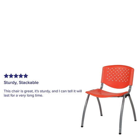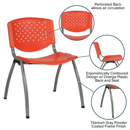 When you need to seat guests in your hair salon, barbershop, tire or body shop this plastic stack chair will bring comfort to guests waiting for service. Guests will love the wider seat design that is curved for comfort. The innovative ergonomic design provides angled seating for your visitor's to comfortably recline while reading a book or scrolling through their phone. Setup training rooms using stackable plastic chairs to be placed around training tables. When you arrange for guest speakers in your classroom or community center, place several plastic chairs in a row. The stacking chair features a perforated back, textured seat to sit safely and a titanium gray finished powder coated metal frame that holds up to 880 pounds. Whether you need to furnish a small or large business there's no job that this heavy-duty plastic guest chair won't be able to handle. These orange plastic stack chairs stack up to 25 chairs high and can be transported across the facility on our steel stack chair and church chair dolly.