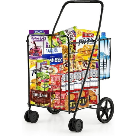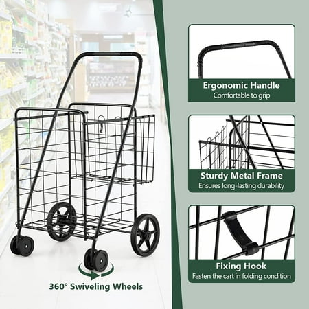 The SUGIFT black folding shopping cart has a wide range of applications in life, everyday grocery shopping, laundry, daily hauling, or shopping. It can be folded to make it easier for you to store and carry. It is made of sturdy metal and is durable enough to last for years. In addition to the large basket, the extended smaller basket is convenient for you to place small items such as tote bags. This shopping cart features large 9-inch rubber rear wheels and 4-inch universal front wheels to make movement easier and smoother. Don't hesitate to take one home now!