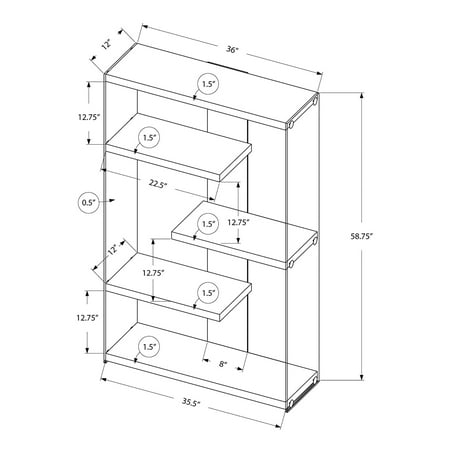 Add a unique storage and display case to your living room or office with the 60 Inch Modern Glass Sided Bookcase with 4 Shelves from Monarch Specialties. This modern bookcase features 3 zig-zag style and a large bottom and top white shelves to display all your favorite books and decorations. These shelves are fixed to side and back glass panels, so you can be sure all your treasures are secure while you view them from any angle. Chrome accents on the outside of this shelving unit add elegant detail that complements the shelf contents, as well as any other existing home decor. Overall, this stylish bookcase measures 36 inches long, 12 inches wide, and 58.75 inches tall, so you'll have plenty of space to display your best items. View your home decor from any angle with this unique 60 Inch Modern Glass Sided Bookcase with 4 Shelves from Monarch Specialties.