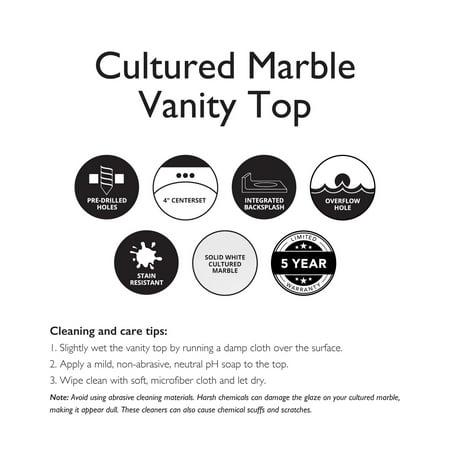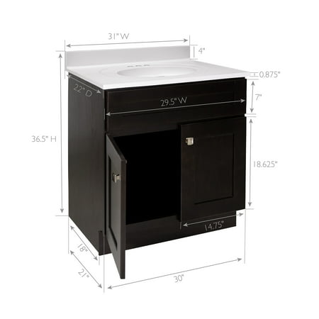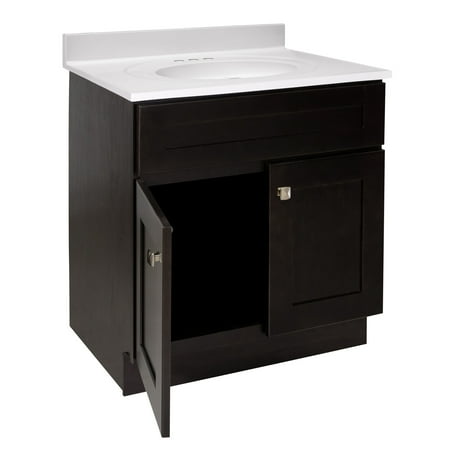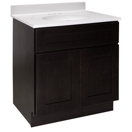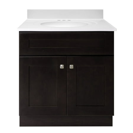 With a classic design, the Brookings Shaker style vanity set takes a simple approach to contemporary decor. Gently recessed paneling creates a smooth, framed look upon each door and drawer front finished in Espresso, perfect for showcasing the square, satin nickel knobs included with this piece. Optimized to fit your bathroom space, this 2-door vanity will store all your essentials and keep clutter out of sight. This eye-catching look is complete with a stunning solid white cultured marble top, creating a dramatic contrast with the rich vanity base and providing long-lasting durability for years to come. The countertop contains three pre-drilled 4-inch centerset holes that sit atop a single integrated oval bowl to make installing a faucet easy. The vanity base measures 30-inches by 21-inches and comes unassembled. Designed and manufactured by Design House, the trusted source for quality lighting, hardware, plumbing, kitchen, and bath products for every taste and budget.This product comes with a 1-year limited warranty.