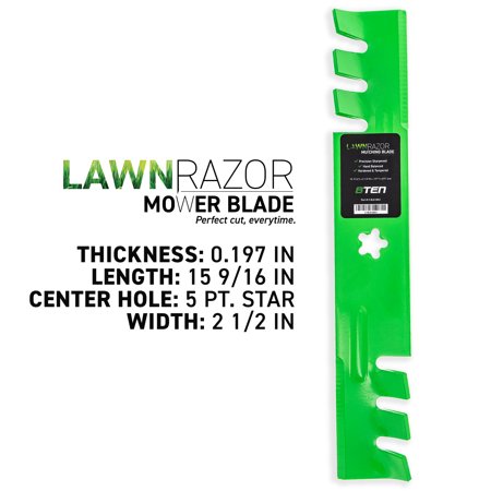 Replacement For OEM Parts Number(s): For Husqvarna Poulan Craftsman AYP RedMax 144767, 157003, 157033, 159705, 170698, 176084, 532144767, 532157033, 532157353, 532159705, 532170698, 532176084, 917144767, 917157033, 917170698 For MTD Cub Cadet Troy-Bilt 340-030, 340-038 For Oregon 595-614, 95-045, 95-614 For Stens 340-070 For Additional Replacement MPN(s): 340-038Toothed LawnRAZOR Toothed Mulching Blade Blade Specs Length: 15 9/16" Width: 2 1/2" Thickness: 0.197" Center Hole: 5 Point Star Replaces OEM Part Numbers Compatible with: AYP 144767, 157003, 157033, 159705, 170698, 176084, 532144767 AYP 532157353, 532159705, 532176084, 917144767, 917157033 AYP 917170698, 917532144767, 917532157353, 917532170698, 917532176084 Husqvarna 532157033, 532170698, 532176084 Fits OEM Models: For AYP Models 4186-64, CT46185A, CT46185B, DPR20H46STA, DPR20H46STB, DPR22H46STA, DPR22H46STB, HDC185H46B, PPR20H46STA, PR20H46STA, PRGT2046A, PRGT2046B, Q165H46A, Q165H46B, Q185H46A, Q185H46B, QGT2046A, QGT2046B, QP20H46A, QP20H46B, QPGT22H46A, QPGT22H46B, RE20H46A, RK20H46A, RKGT22H46A, SGT18H46A, SGT18H46B, SGT18H46C, TS1846A, WE18546A, WE185H46A, WE185H46B, WZ185H46B, Y1846A, YGT1846A, YGT1846B, YGT18H46B, YGT18H46C, YGT2046B, YGT2046C, YGT2046D, YP1946B, YP1946C, YPQGT22H46A For Husqvarna Models Fast Moving Parts, GTVH 205 A, GTVH 205 B, Parts, YTH 1746 A, YTH 1746 B, YTH 1746 YTHK 1746 A, YTH 1746 YTHK 1746 B, YTH 180 A, YTH 180 B, YTH 2046 A, YTH 2046 B For Jonsered Models LTH 18 46, LTH 18 J18H46C, YTH 18 46 Please Refer to Owners Manual Or OEM Manufacturer for Complete Compatibility Verification