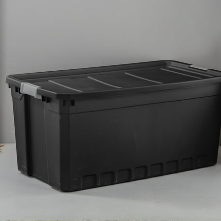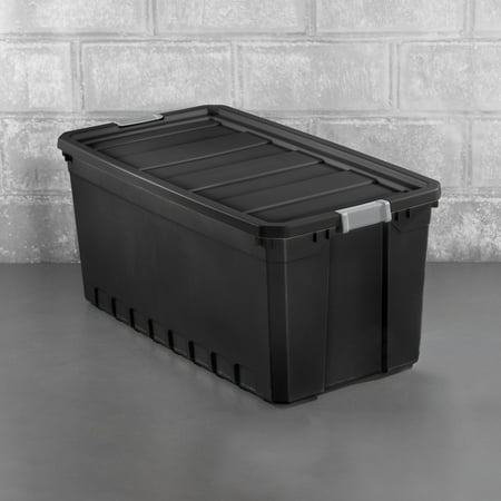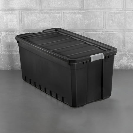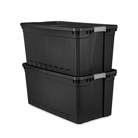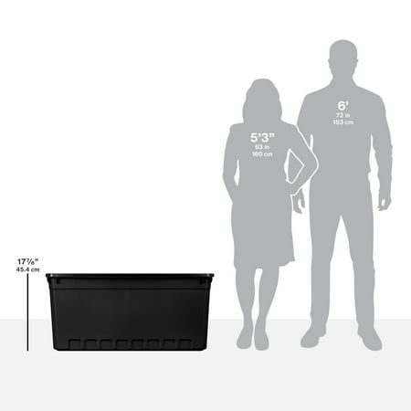 In need of a durable storage system for closets, basements, garages, or attics? The Sterilite Modular Stacker line features rugged construction for added peace of mind that contents will stay safely stored inside. The 50 Gallon Stacker Tote is the perfect size for camping gear, sports equipment, seasonal decorations, and other bulky items, and the opaque base allows contents to be out of sight. The robust latches offer extra security that the lid will stay attached to the base, and the textured surface makes for a sure grip when carrying. The deep recessed lids provide stability when stacking for efficient use of storage space. The 50 Gal Stacker Tote shares the same lid as the 200 Qt Stacker Box allowing secure stacking and the clear and opaque versions to be stacked interchangeably. The overall assembled dimensions of this item are 39 3/4" L x 21 1/2" W x 17 7/8" H.