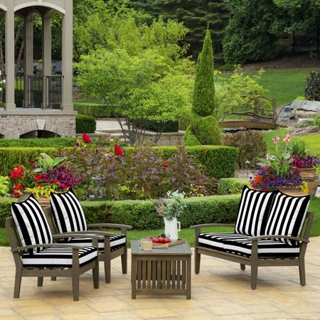 The Arden Selections Outdoor Deep Seat Set is made for your deep seat chair, conversation set or couch with long-lasting outdoor polyester fabric with PFAS-Free C0 treatment. Creating an ultra-comfortable outdoor deep seat cushion that is also eco-friendly and Skin-safe for your family. The set includes one large pillow back that features a welt detail and one deep seat bottom. The pillow back measures 24 in W x 21 in L x 6 in T and the bottom cushion measures 24 in W x 24 in L x 5.75 in T. The 100% printed polyester outdoor fabric resists fading, so your patio cushion looks vibrant for longer. Skin-safe C0 water protection helps your cushion set withstand continued outdoor use, while easy cleaning with just soap and water make for low-maintenance upkeep. Two sets of ties on the seat bottom make sure your outdoor deep seat cushion stays firmly in place. The pillow is made with 100% recycled polyfiber blowfill and the bottom is made from partially recycled polyester fill to help it retain shape and provide long-lasting comfort during outdoor use. Although this deep seat cushion set is both water and UV-resistant, we recommend bringing it indoors when it rains or when not in use to preserve its lifespan and keep it looking beautiful.