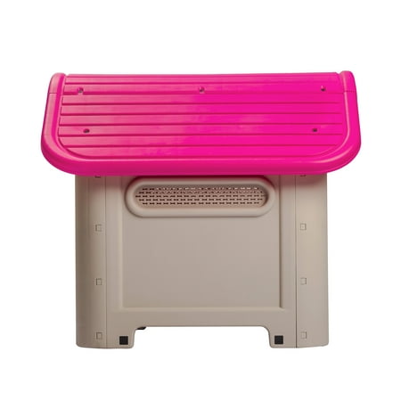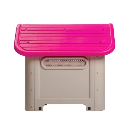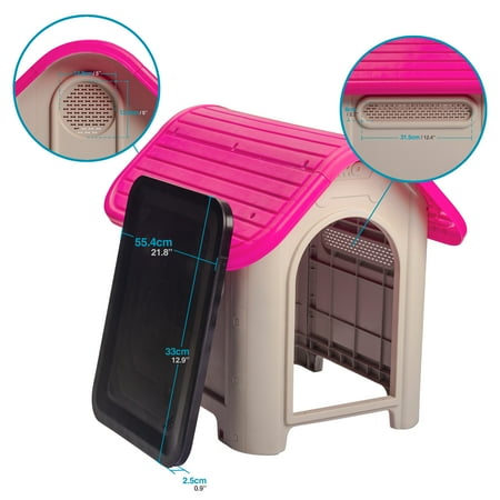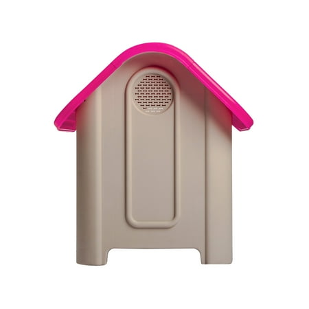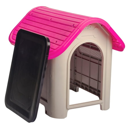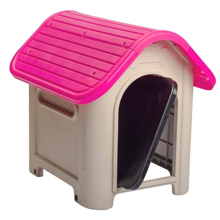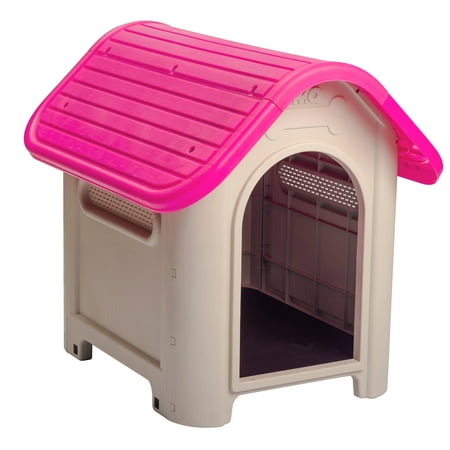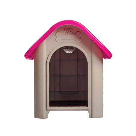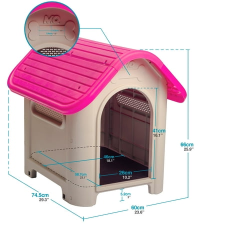 The MQ Dog House includes a matching bowl and is perfect for small/medium breeds. It's unique floor design allows the floor to be removed for easy cleaning and interior cleaning. Both dog house and bowl are made of durable polypropylene resin that is moisture, rust, stain and scratch resistant. Construction also features UV protection. The roof design prevents rain or other weather elements from getting inside. Side and rear ventilation allows for maximum pet comfort. Elevated design keeps your dog of the direct ground. Accompanying bowl can be used for water or food. Both dog house and bowl are perfect for indoor or outdoor use. Overall dog house dimensions are 25.9"H x 23.6"W x 29.3"D. Door entrance measures 16.1"H x 10.2"W. Hardware is included and easy assembly is required. Available in Espresso/Beige, Turquoise/Beige or Magenta/Beige.