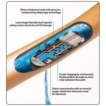 Rain Birds copper-colored subsurface emitter tubing with copper shield provides 90% watering efficiency, right at the root zone. Rain Birds patent-pending copper shield technology protects the emitter from root intrusion, creating a long-lasting, low maintenance sub-surface drip irrigation system for use in organic gardens or shrub and groundcover areas. Having the copper color outside ensures the copper chip is inside and that your dripline is protected from root intrusion. Brand Name: Rain Bird Tubing Material: Plastic Product Type: Drip Irrigation Emitter Tubing Tubing Size/Outer Diameter: 1/2 in. Tubing Length: 50 ft. Flow Rate: 0.9 gph Packaging Type: Carded Maximum PSI (Pressure Rating): 60