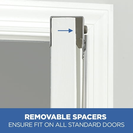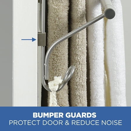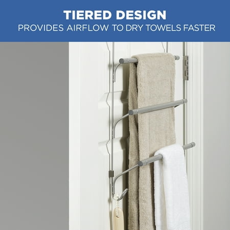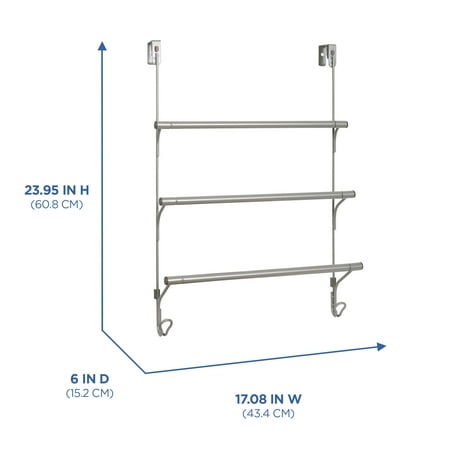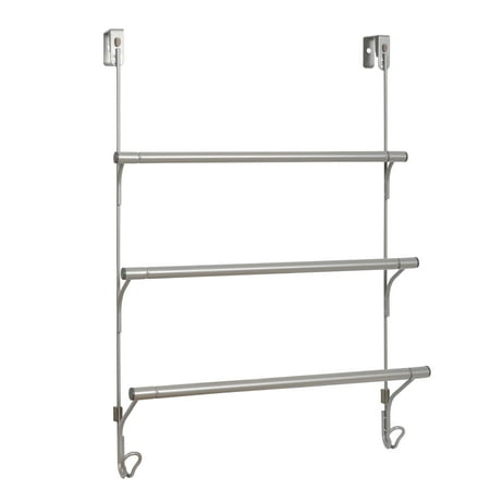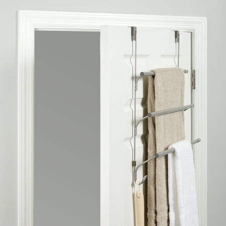 The Mainstays SnugFit over-the-Door 3-Tier Towel Bar with 2 Hooks adds space for hanging towels in any room that needs it. Patented SnugFit technology allows this over-the-door towel rack to be installed easily and tool-free over any standard interior door. Scratch-resistant spacers ensure a secure fit and quiet-close bumper guards prevent damage to your door. The tiered design provides airflow and helps your towels dry quickly. The portable towel rack works in bathrooms, laundry rooms and more, and its stylish satin nickel finish complements most furniture and decor styles.
