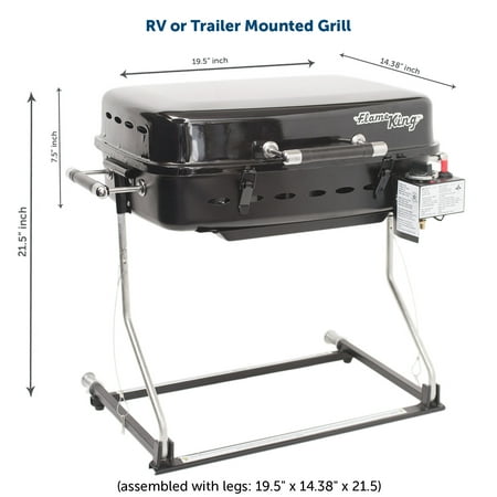 Flame King's new RV, motorhome, and trailer mountable BBQ and grilling station is a must-have for tailgating and camping events! This RV-compatible gas grill comes with its own bracket system, allowing you to mount it to the side of any motorhome or trailer. This gas grill uses your RV's self-contained LP gas system, making it extremely convenient. The BBQ hanging rack can also be used as legs to make the grill free-standing. Set up and put away is easy, and a complete installation guide is included with the grill. Approximate Unit Dimensions: Assembled Without Legs 19.5” L x 14.38” W x 7.5” H. Assembled With Legs 19.5” L x 14.38” W x 21.5” H. NOTE: This grill is only intended for use with the RVs self-contained LP gas system or 5, 10, 20, 30 or 40 lb propane cylinders.