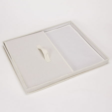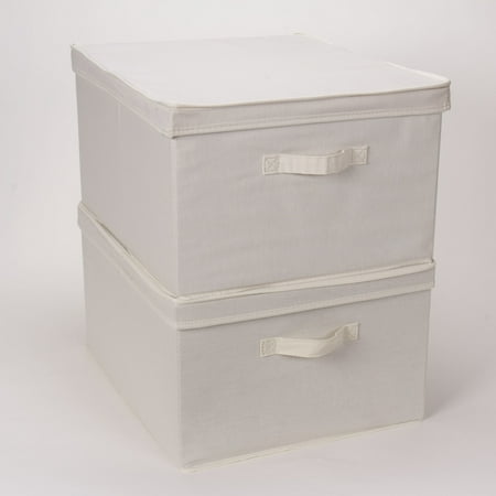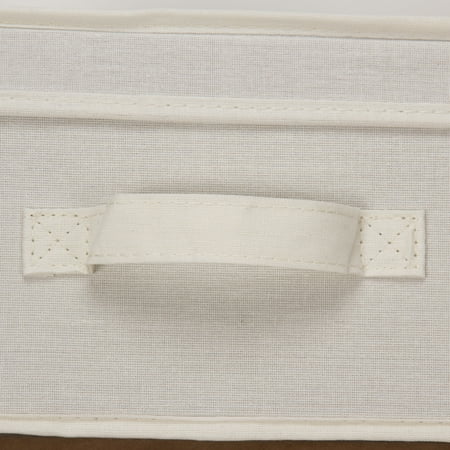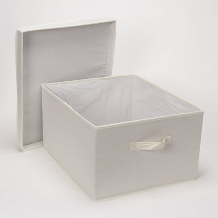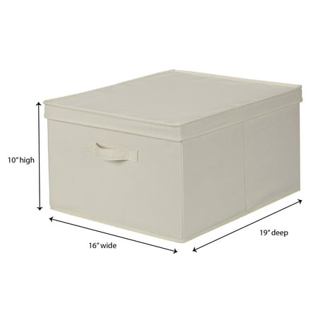 This large storage box with lid offers an abundance of accessible and versatile storage space. With its charming exterior and sturdy construction, this storage box can be used in any room of the home to cut down on clutter and organize your living space. Offered in a jumbo size for the utmost storage capacity, this elegant storage box has an unlimited amount of storage potential. The solid sides and reinforced base provide an ample amount of protection to the contents. The canvas is made of a poly-cotton blend--soft to gently cradle delicate items, but durable to prevent snagging and stand-up to daily use. The neutral yet natural color of this canvas can easily be paired with your style at home. To maximize space, this large storage box can be stacked or folded while not in use. The fully removable lid offers quick and easy access to all of the items stored, making it perfect for both short and long term storage. The single front handle is a convenient way to pull this box out from shelves or cubbies. This large canvas storage box can be used for large, awkwardly sized items or an abundance of smaller items. Use this storage box in the closet to hold seasonal gloves, jackets, boots, scarves, blankets and other accessories. It could also be used in the crafts room to hold extra fabric, yarn or boxes of beads and buttons. This could also be used in the bathroom pantry to hold washcloths, towels and toiletries.