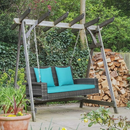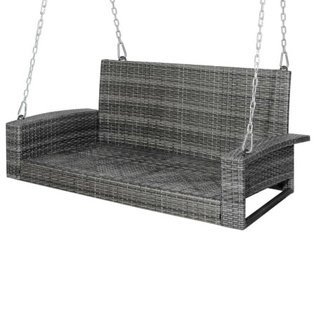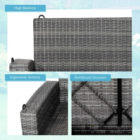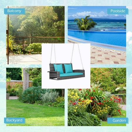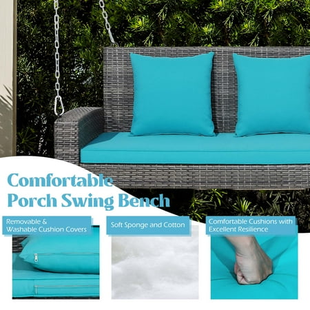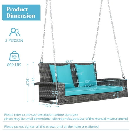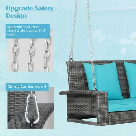 Description: Enjoy swinging back and forth on our 2-person patio swing chair! The main frame of the swing chair is made of heavy-duty steel pipes, which ensures high stability and security. And the rust-resistance steel frame with weatherproof PE rattan surface can withstand long-time outdoor use. Coming with a long seat cushion and 2 back cushions filled with soft sponge, the swing chair offers a comfortable sitting experience to you. And the heavy-duty steel chains with carabiners allow you to swing with high safety. Come and relax with your beloved one on our porch swing chair! Features: Wide sitting area allows you to swing with your best friend Comfortable backrest and armrests make you fully relaxed Weatherproof PE rattan withstands long-time outdoor use Sturdy steel frame for strong weight capacity which is 800 lbs Seat and back cushions filled with sponge provide much comfort Specification: Color of PE Rattan: Mix Grey Color of Cushion: Turquoise Material: PE Rattan, Steel, Polyester, Sponge Overall Dimension of Swing: 50'' x 22.5'' x 21.5'' (L x W x H) Dimension of Seat Cushion: 42.5'' x 21'' x 2'' (L x W x Thickness) Dimension of Each Back Cushion: 15.5'' x 15.5'' x 6'' (L x W x Thickness) Fully Extended Length of Each Steel Chain: 94.5'' Net Weight: 29 lbs Weight Capacity: 800 lbs Package Includes: 1 x Porch Swing 1 x Seat Cushion 2 x Back Cushions 2 x Steel Chains 1 x Instruction
