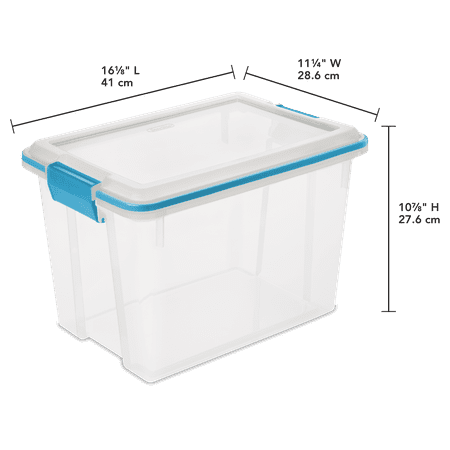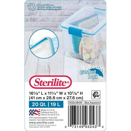 Sterilite' s Gasket Box line is the ideal storage solution for keepsakes, photographs, important documents, linens, and other items that need to be stored away and protected. Gasket Boxes offer a gasketed seal to safeguard items from both air and moisture, keeping those special belongings safe from the elements, dust and pests. Durable, tight-fitting latches keep the lid secured to the base, and the clear lid and base allow contents to be easily identified, without opening the lid. The 20 Quart size is ideal for organizing school projects, paperwork and photographs that need to be protected, and fits conveniently on 16" wire closet shelving, making it ideal for organizing and storing small items in the closet. The gasketed seal also helps to keep pet food and other bulk foods fresh longer. The Gasket Box line has eight sizes, ranging from 7.5 Qt to 120 Qt, providing a variety of storage options for those items that need to be kept safe as well as for longer term storage needs. The 12 Qt and 20 Qt Gasket Boxes use the same lid, allowing both the shallow and deep sizes to be stacked in same footprint.