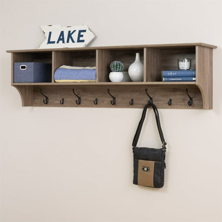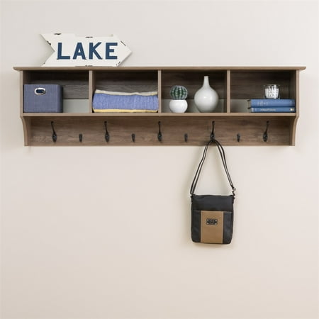 Ideal for an ever expanding household, the 60" Wide Hanging Entryway Shelf will keep your entryway belongings together in one place! Suitable for any front hallway, foyer or mudroom, the four compartments provide ample storage for everyone in your family. Fill with baskets, gloves, mittens, hats and books. Five large and four small hooks provide plenty of places to hang jackets, coats, hoodies, sweaters, bags and purses. Installs easily with our innovative hanging rail system. Features: Finish: Gray Laminate Dimensions for Each Cubbie: 8.75 " H x 13.5 " W x 10 " D Easy to install 2 piece hanging rail system included Constructed from CARB-compliant, laminated composite woods Ships ready to assemble, includes an instruction booklet for easy assembly Proudly manufactured in Canada 5-year manufacturer’s limited warranty Specifications: Product Dimensions: 16.5 " H x 60 " W x 11.5 " D Product Weight: 40 lbs