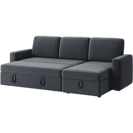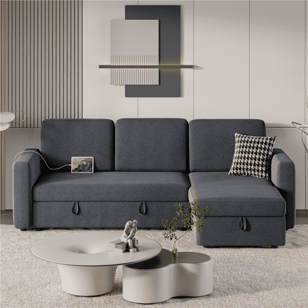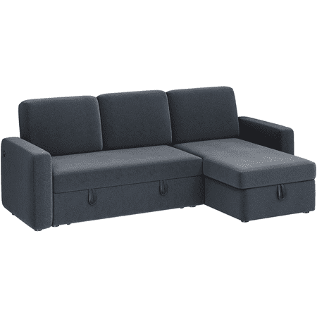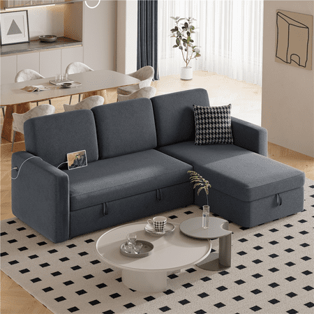 The reversible sectional sofa is crafted from a sturdy engineered frame, 100% polyester upholstery, foam fill, and metal spring for enhanced sturdiness and durability. The chaise can be placed on either the left or right side of the loveseat to meet different requirements of space. The trundle sleeper mechanism hidden under the loveseat helps the sofa easily pop up to a comfy double/full bed for 2 sleepers. The two strap handles and bottom wheels make for fluent and effortless operation. The clean-lined silhouette works harmoniously with the neutral-colored upholstery to sport an effortless low-profile look. The clean-lined silhouette works harmoniously with the neutral-colored upholstery to sport an effortless low-profile look. This sofa bed is a welcome addition to most home styles.