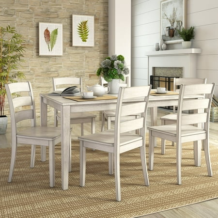 Enjoy breakfast, lunch or dinner with family and friends while dining with the Lexington Dining Set. Made by solid rubber wood frame provides strength to this piece of furniture. Comes with 7 different finishes, dining set provide a classy appeal and is easy to clean. This dining set can sit up to 6 people. This indoor dining set includes a rectangular dining and table and 6 sleek ladder back chairs. Assembly required.
