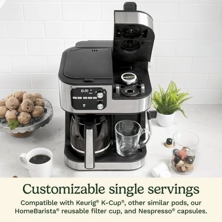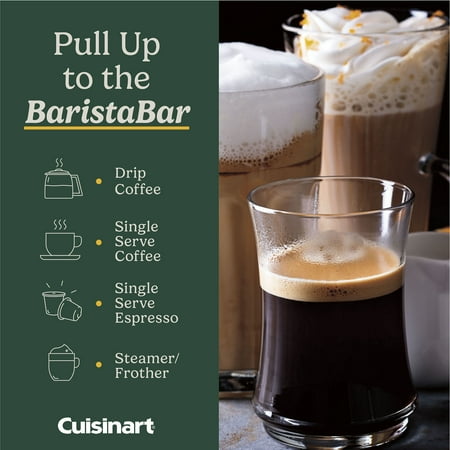 Bring the café home with the new Cuisinart® Coffee Center® Barista Bar, and experience four brew options with compact convenience. Serve friends and family with 12 cups of fresh coffee brewed to perfection with programmable time, temperature, and strength settings. Or go solo with single-serve cups, in 6-, 8-, and 10-ounce sizes, made in minutes and compatible with most single-serve pods. For extra-bold flavor, pop in a Nespresso® OriginalLine-style capsule, and enjoy a single or double shot of espresso. Add variety to drinks with the steam wand that makes frothed and steamed milk for cappuccinos, lattes, or the specialty drink of your choice. The wand is also perfect for pouring hot water for tea, matcha, hot cereals, and soups. With sleek modern styling and total versatility, this space-saving all-in-one unit is sure to be the favorite spot in any kitchen.