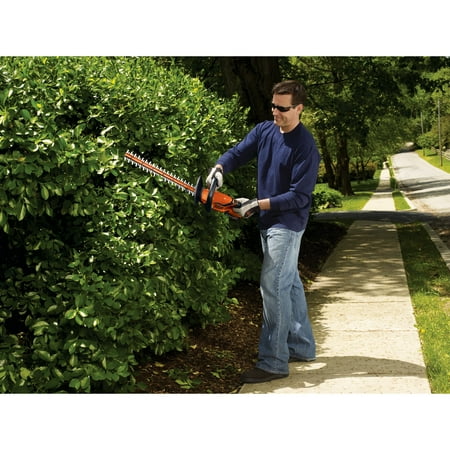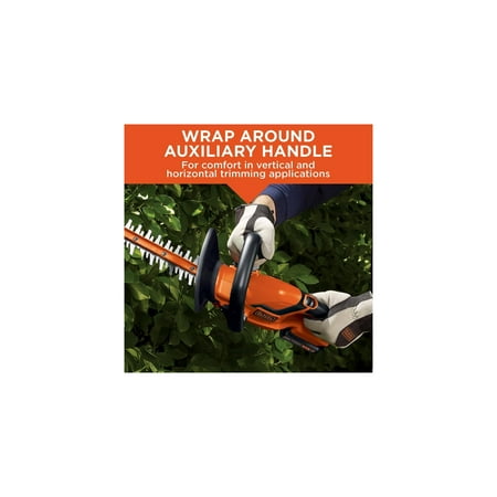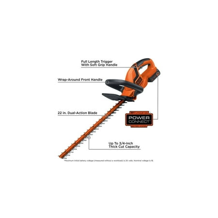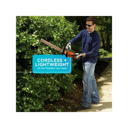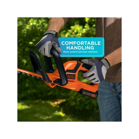 The BLACK+DECKER 20V MAX* Lithium Ion Cordless 22" Hedge Trimmer is ideal for trimming hedges, shrubs and bushes without extension cords. It has 22 inch dual-action blades which cut branches faster and easier with 40% less vibration. This unit is compatible with 20V Lithium Ion rechargeable battery delivering power and run-time for most trimming jobs. It quickly cuts branches up to 3/4 inch thick. This trimmer can also handle up to 3,000 sq ft of actual hedges trimmed per charge. It features a full wrap-around front handle which provides a comfortable gripping area in all cutting orientations, along with soft grips for comfortable use and secure gripping. Includes (1) LHT2220 Trimmer, (1) 20V MAX* Lithium Ion Battery, and (1) Battery Charger.