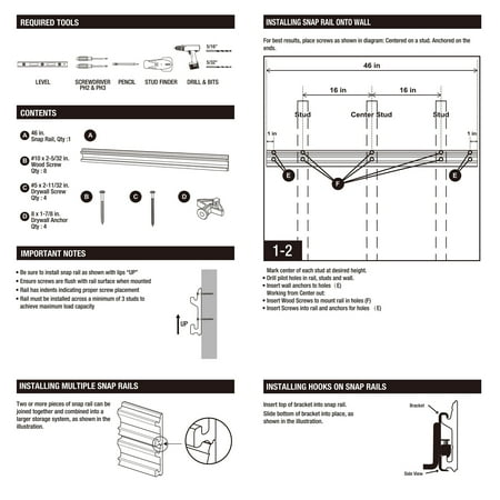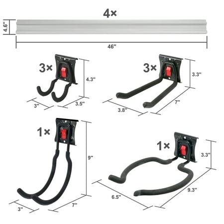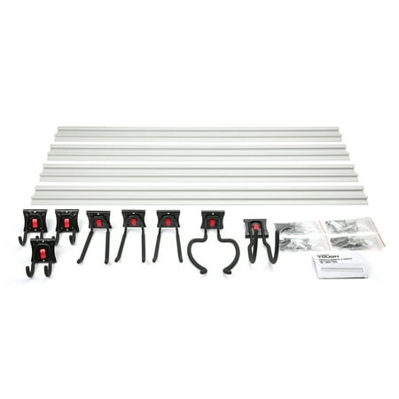 The Hyper Tough 12-Piece Quick-Release Snap Rail Kit Garage Organizer System helps clear clutter in the garage or anywhere you need extra storage and more organization like the basement, attic, pantry, or even the laundry room. This rail kit is easy to install and includes four-pieces of 46-inch snap rail and all the hardware necessary to mount it to your wall. Also included in this kit are eight snap rail quick release steel hooks; three, three-inch U-hook, three, six-inch straight hook, a six-inch U-hook, grass trimmer hook, and all mounting hardware. All hooks are coated to protect your belongings from marring. The snap rail will not rust or warp. Each 46-inch section of snap rail holds up to 100 total pounds (75-pounds per foot maximum). These quick release hooks are simple to remove and re-attach with the push of a button, making it easy to organize and re-organize a wide variety of items on the snap rail, freeing up valuable floor space. Customize the storage anywhere in your home using multiple kits and additional accessories. Keep your garage organized with the Hyper Tough 12-Piece Quick-Release Snap Rail Kit Garage Organizer System.
