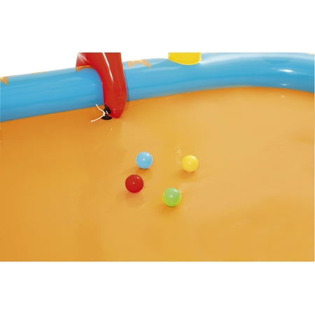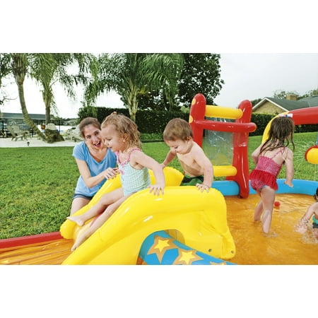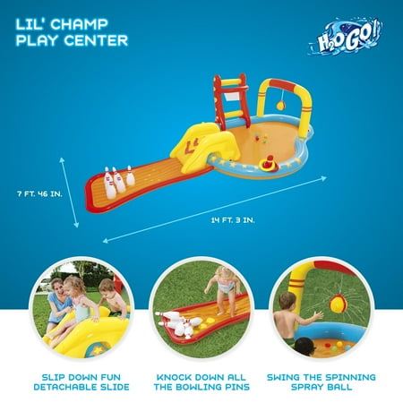 Designed to get kids moving, grooving and out of the house, the H2OGO!® Lil' Champ Play Center is quality-tested and puts the focus back on fun! This play center has it all for a fun day of sports! Bowling, basketball, tether ball and a fun ring toss turn this play center into a mini-waterpark that will keep your kids having fun and keeping score while they play the day away. Also included is a removable slide that can be tied down with tie ropes and grommets. The Play Center comes with 6 bowling pins, 2 inflatable rings, and 4 play balls. The inflatable cushion on the pool floor provides extra comfort for little ones. The water sprayer attaches to your garden hose, keeping your kids cool during the hot summer months! With enough room for friends, splashing in the sun has never been more fun than with the H2OGO! Lil’ Champ Play Center!