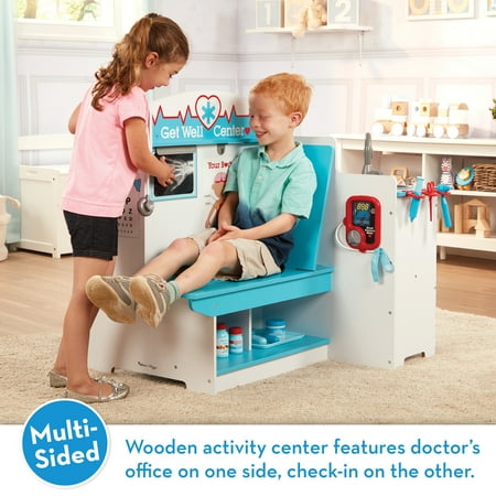 This sturdy, multi-sided wooden play space has everything kids need to role play visits to the doctor’s office! Kids can be the patient or the doctor, the receptionist, or the nurse. It’s a great way to ease kids’ fears about doctor visits and to encourage nurturing and empathetic play. The waiting area includes a seat, clock, and fun changeable artwork. Sign in and check out with a credit card reader and card, fill out a reusable patient file, and take appointments with the wooden play phone. Wash up in the sink, display X-rays, monitor blood pressure, tip the scale, measure height, and read the eye chart. There’s plenty of storage in this easy to assemble play space (illustrated instructions included; Phillips head screwdriver required). Standing 35.5” x 37.25” x 21.25”, there’s also plenty of room for imaginations to grow! This product is certified by the Forest Stewardship Council. FSC certification ensures that products come from responsibly managed forests that provide environmental, social, and economic benefits, and that forests are protected for future generations. Please note that FSC certification applies to new inventory only (FSC C156584)
