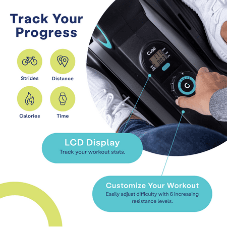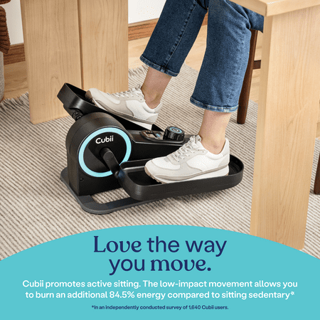 Take the first step of your health and wellness journey with the Cubii Move elliptical! With the New Cubii Move Compact Seated Elliptical Trainer, you can get the low impact & cardio benefits from the comfort of your favorite seat! he simplified design provides a convenient workout that helps activate six muscle groups and increase leg mobility. The whisper-quiet flywheel allows you to pedal with a smooth and natural stride. The Cubii Move Compact Seated Elliptical Trainer features an easy-to-read LCD monitor that displays your progress for easy tracking including calories burned, distance traveled, rotations per minute, and active time. Its sleek, compact design fits in front of your favorite chair or couch, and under almost any desk or table The Cubii Move Compact Seated Elliptical is portable and weighs less than 20 pounds, making it easy to move from room to room. Increase the intensity or choose a gentler workout by adjusting between six levels of resistance. Try Cubii Studio+, our new wellness platform that includes live and on-demand exercise classes. All workouts are taught by expert trainers who teach various class types. With classes that range from five to 30 minutes long, find the perfect workout to fit seamlessly into your schedule.