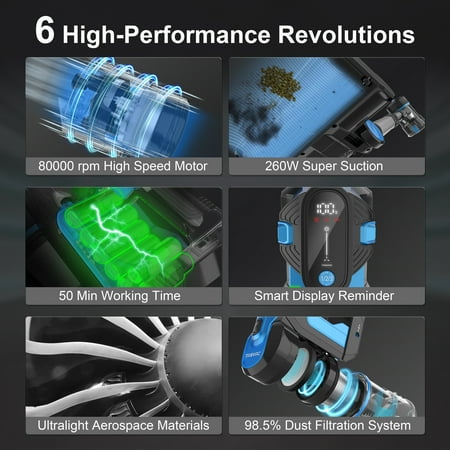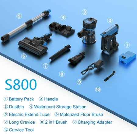 2022 New S800 hardwood floor carpet vacuum with polished clear LED display combines power display, brush lock rotor display, low battery reminder, duct blockage reminders in one. You can learn about your stick vacuum cleaner in real-time, in case you need it.2200mAh detachable large capacity battery 8-Cell Lithium-Ion batteries inside supporting the cordless vacuum cleaner with a longer runtime.Our unique battery-saving technology ensures that the suction of the vacuum cleaner is always in a state of high power and low power loss. If you have a large area of hardwood floors to vacuum, this cordless option with good battery life is extremely convenient. Let's See How can S800 Cordless Vacuum Cleaner be A Cost-effective Cordless Stick Vacuums! 260W Motor+3 speed suction power ---The cordless vacuum provides continuous 28Kpa extremely powerful suction in MAX mode so that instantly picks up pet hair, fine dust, debris, large particles from carpet, hardwood floor, tile floor, marble floor, etc. ---10kpa - Standard mode can offer up to 50 minutes continuous cleaning,28kpa - Max mode can offer up to 20 minutes deep cleaning,14Kpa - Mid-range model can offer up to 30 minutes deep cleaning 5 stages filtration system+Extendable Tube+Motorized Brush with LED Light ---5 Stages High-density filtration technology provides pure air for your family and prevents secondary air pollution for an excellent cleaning experience ---This excellent cordless vacuum can meet various household cleaning demands on stairs and windowsills, sofa and bed, desk and curtain, cars, RV, etc ---Vacuum cleaner cordless with motorized cleaner head with bright LED lights, you can swivel the wand sideways and up and down to easily clean the dust in every corner or under the sofa Convenient Charging +Easy Storage+1L Large Dust Cup ---Charge the compact vacuum cleaner cordless directly or charge the battery part separately both ok ---The hard surface vacuum has a wall mount to place or detached storage. Cordless vacuums for carpet and floors keep your home tidy and organized ---Lightweight vacuum cleaner cordless with a one-touch, easy-empty 1L large dust cup, larger than similar products Cost-effective Vacuum Cleaner with Smart Reminder LED Screen ---260W powerful suction supports all-round cleaning ---Brush Lock Rotor Display, Low Battery Reminder, Duct Blockage Reminders 2200mAh Rechargeable Li-ion Battery Capacity ---Offer up to 50 minutes working time,One full charge = whole house cleaning Specifications: