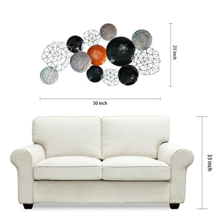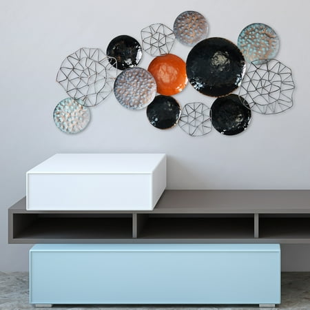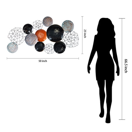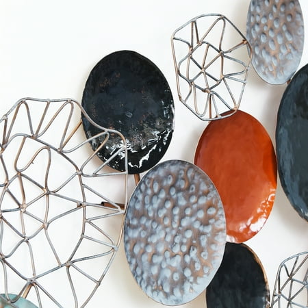 This work could almost be mistaken for a science fiction model, a representation of some distant or imaginary planets, their startling forms orbiting a sun that drifts through an alien dimension. The piece shows several discs of brightly polished metal, showing different colours, from a Verdigris green to a rich, gold-tinged black. Interspersed are frameworks of metal sculpture, contrasting with vivid sharpness against the smooth round orbs. A strange piece, this is bound to spark conversation. Features Plateau Hand Painted Etched Metal Wall Sculpture All hand-made sculptureSpecifications Weight: 11.9 lbs - SKU: EPAD2637