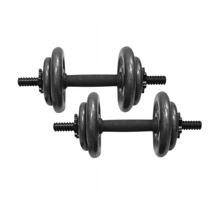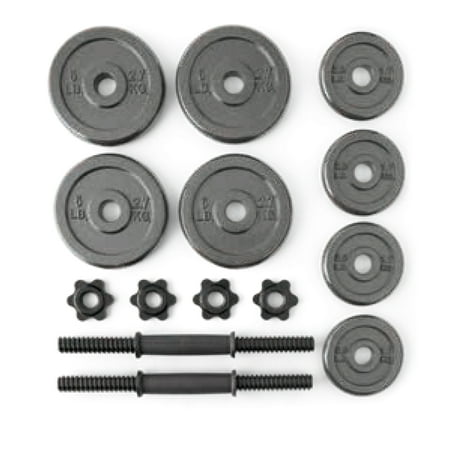 The Athletic Works 40lb Adjustable Cast Iron Dumbbell sets an effective workout choice for both beginners and advanced fitness enthusiasts. This Athletic Works 40 lb dumbbell set comes with several weight plates that allow you to create several weight combinations with the dumbbells. Weights can be gradually added to this barbell dumbbell set as the workouts intensify. This 40lb dumbbell set also has spin lock collars to secure the weights in place. This dumbbell set features solid cast iron construction with an enamel finish that lasts for years. This adjustable dumbbell set is great for home use, as it does not require a lot of space for use or storage. This set includes: four 6lb plates, four 2.5lb plates, 2 threaded solid dumbbell handles, and 4 spin-lock collars.