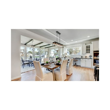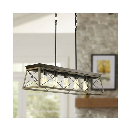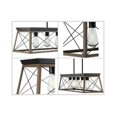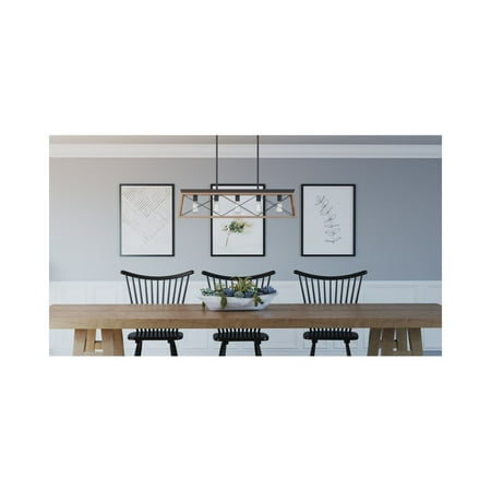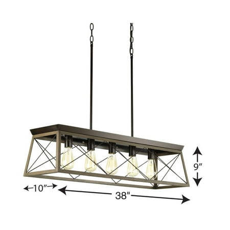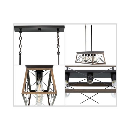 Create a rustic aesthetic with a linear chandelier from the Briarwood Collection. A comforting country glow peeks through the classic X-brace design reminiscent of charming country barn doors and rustic farmhouse gates. The faux wood frame is coated with a rich painted oak finish and accented by an antique bronze plate. Ideal for vintage filament bulbs (not included). Compatible with dimmable bulbs.