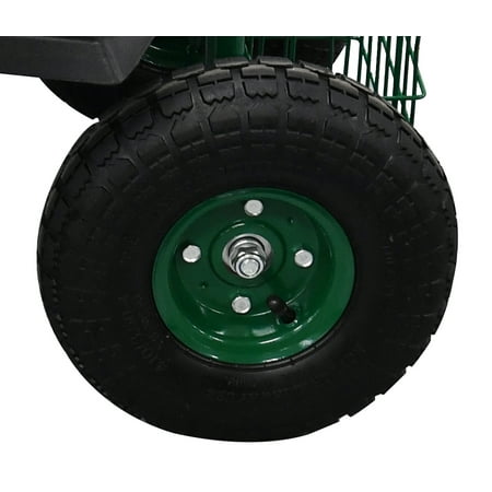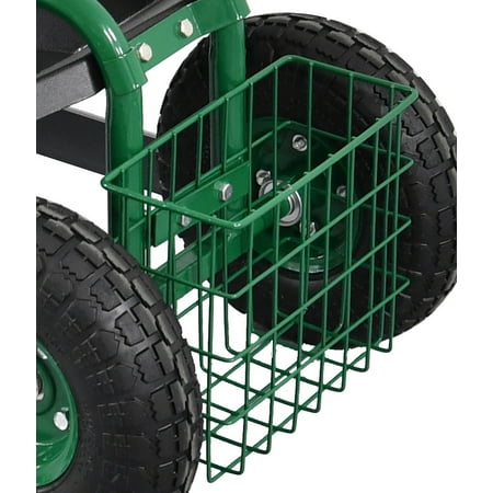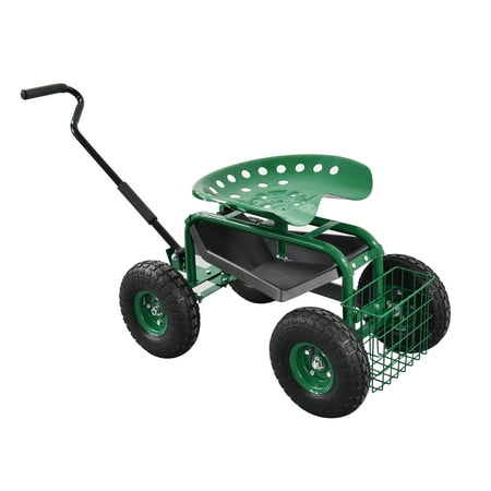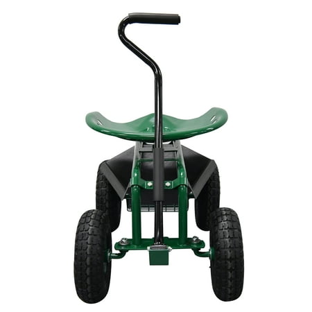 The Expert Gardener Stool with a 360 degree green swivel seat makes it a convenient addition to any outdoor landscaping routine. Pneumatic tires make this stool mobile. The adjustable height steel seat can adjust from 16 in. to 2 in. in height. The seat has a built-in swivel feature that allows for easy rotation. Which makes it easier to plant flowers, vegetables and plants. The cart also features a heavy duty powder coated steel frame in the perfect farmer green color. It comes with steel axles, pneumatic tires, and a black plastic tray for holding tools and accessories. The product size is 34.25in x 17.32in x 20in and weighs 32lbs. The handle allows for the stool to be easily pulled when not in use.