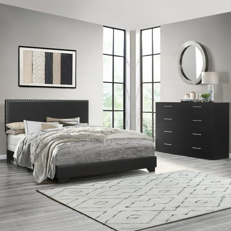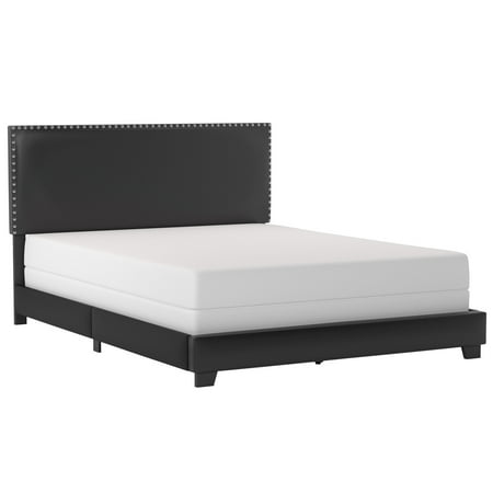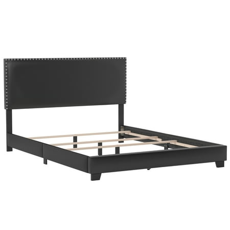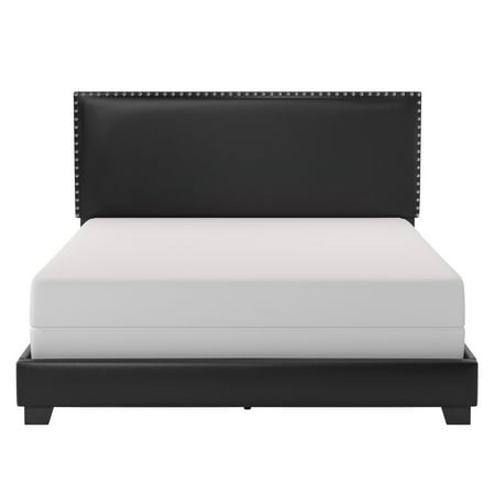 Drift off to dreamland in style with the adult fully upholstered Willow Queen Bed, a pick that pairs a traditional silhouette with bold silver hued nail head trim. Paired with a faux leather, and espresso finished feet, this adult bed is dramatic, yet simple, and blends well in most décor, while providing fresh flair into your master, guest, or youth décor. Crafted with a solid wood frame, this adult bed requires both a box spring and mattress to complete the look. Assembly required.