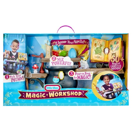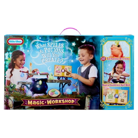 Little Takes® Magic Workshop™ lets children enter a magical world filled with potions, spells, singing, laughter, and more. Just follow along with the easy-to-use spell book and add the enchanted ingredients to mix up the perfect potion. Your wizard skills let you cast endless spells with a magical frog who will enthrall with his silly lights, sounds, and songs. The Magic Workshop is where magic is fun and fun is magic. Mist added for effect only. The Magic Workshop does not produce actual mist. Ages 3+
