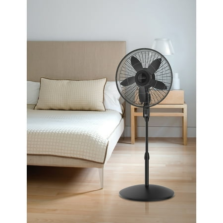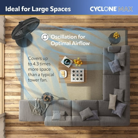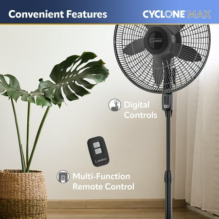Experience cooling and comfort with the Lasko Cyclone® Max 4-Speed Remote Control Pedestal Fan with 18-inch fan blade. This floor fan features a metal grille that ensures durability and also operates quietly. The 18" high-velocity blade moves air at a speed of up to 1,378 feet per minute, providing a powerful breeze that cools any room. This pedestal fan circulates air up to 19 times an hour in extra-large rooms and 38 times an hour in larger spaces, making it an ideal addition to bedrooms, dining rooms, basements, offices, and kitchens. Unlike conventional tower fans, this Cyclone® Max covers up to 4.3 times more space, ensuring air distribution throughout your room. Features customizable height settings, allowing you to modify the fan's height from 41 inches to 53 inches for tailored airflow direction. The widespread oscillation feature ensures complete room coverage, while the tilt-back fan head enables precise adjustments of airflow up or down to suit your preference. Manage your cooling experience with electronic controls offering 4 high-performance speeds. Enjoy the convenience of the multi-function remote control, granting you the power to operate the fan from a distance, adjusting speeds or turning it on/off with ease. Setting up your Cyclone® Max stand fan is a breeze with its tool-free assembly. Safety is paramount, and with the trusted Blue Plug technology, this fan prioritizes your well-being by promptly responding to short circuits, ensuring a secure user experience. This fan also comes with a 1-year limited warranty.