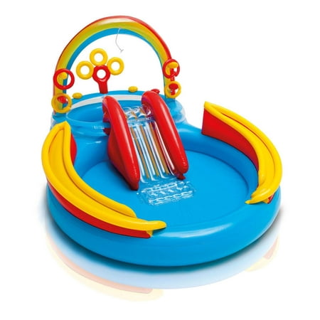 Your little swimmers will have a spectrum of colorful fun with this Intex Inflatable Rainbow Ring Water Play Center. This swimming pool is filled with fun. It has a slide, ring toss game, ball roller game, ball toss game, water sprayer, and comes with 6 colored balls. This play center is for swimmers ages 2 and up and keeps children playing for hours on end. There is a wading pool and a main pool and room for 5 to 6 little ones. Summer should be full of fun, sun, and splashing around in the water. This Intex Inflatable Rainbow Ring Water Play Center is perfect for cooling off and playing games with your little friends.