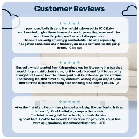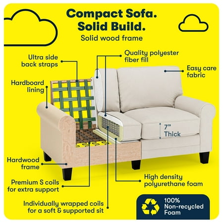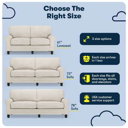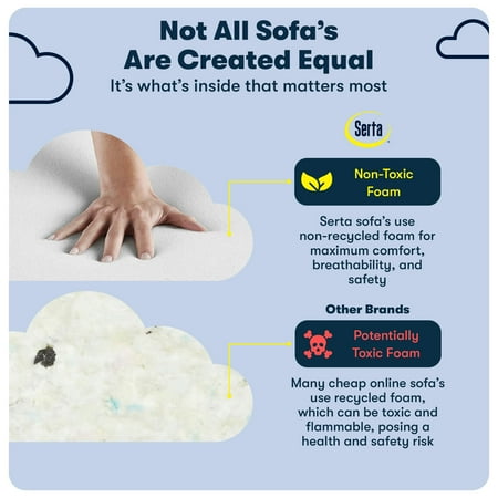 Whether you're furnishing your first home or seeking a space-saving solution for your existing space, Serta delivers. Our conveniently packaged sofas arrive directly at your door in one carton, and they provide the perfect blend of style and comfort you've come to expect from Serta. Don't let living in a modestly sized apartment, or being on a managed budget, be the limiting factors to creating a welcoming home. The Serta Copenhagen collection is designed specifically for smaller living spaces, offering 61", 73" and 78" length options. With a seat depth of 20.5" you can still relax comfortably without the sofa taking up too much space. However, this means the sofa's proportions are better-suited for users under 6 feet tall. The unopened box will fit any doorway, hall, stairwell, or elevator. Once in your home, it will thrive in smaller living rooms or home offices, but is a versatile choice for dorms, kid’s rooms, den, and family rooms. Plus, its low-profile will make any smaller space feel open and airy, giving the freedom to mix and match with other furniture pieces. This inviting sofa features clean lines and rolled arms for a timeless look. Upholstered in an anti-pilling polyester fabric or durable bonded leather, the Copenhagen is easy to care for and spills are simple to clean. 13 color options are available to complement your décor. Please note that the actual color may differ slightly from what appears online depending on the amount of light and the positioning of the sofa in any space. Soft pillow backs, generously filled with soft fibers, rest against a backrest with structured webbing to keep things comfortable and supportive. The seat cushions are filled with high-density, non-recycled Serta quality foam, which cover individually wrapped pocket coils for a supportive core and semi-plush sit. Welcome the Serta Copenhagen Sofa into your home for modern style and comfort with space-saving functionality. Lounging or relaxing has never been so convenient. Features: SPACE-SAVING DESIGN: Its compact size and low-profile (61" wide x 33" deep x 36" high) make this two-seater couch a great choice for smaller apartments or lofts, living rooms, or home offices. Fits all doorways, halls, stairs or elevators. Better-suited for users under 6ft tall. MODERN CLASSIC: Combines traditional and minimalist design with rolled arms for a sleek and modern look. Upholstered in a no-pill polyester fabric or smooth bonded leather with piped edges for a tailored finish in 13 color options. Easy to clean and maintain. SIT BACK & RELAX: The loose pillow backs are generously filled with soft fibers and supported by structured webbing within the backrest for comfort and support. The pocket coil seat cushions filled with high-density foam provide a semi-plush sit and have removable covers for effortless cleaning. SERTA FOAM & BUILD: Made of a solid wood frame fitted with sinuous springs for extra support and sturdy solid wood legs that can handle up to 450 lbs. All Serta sofas use quality, non-recycled foam for breathability and safety. EASY ASSEMBLY: Simple and quick assembly with hardware kit included. We offer USA Customer Support.