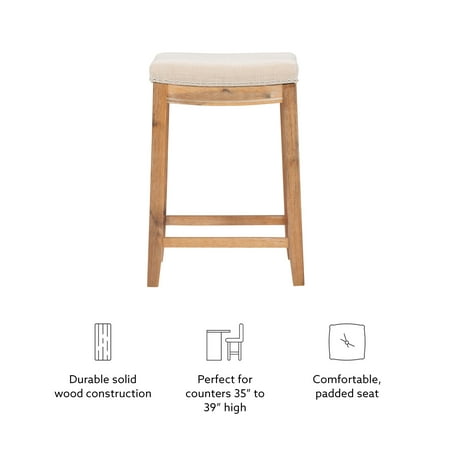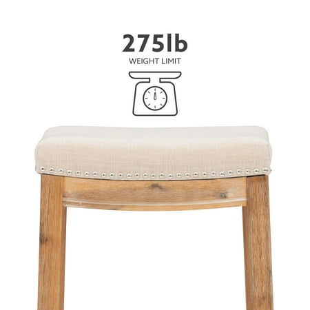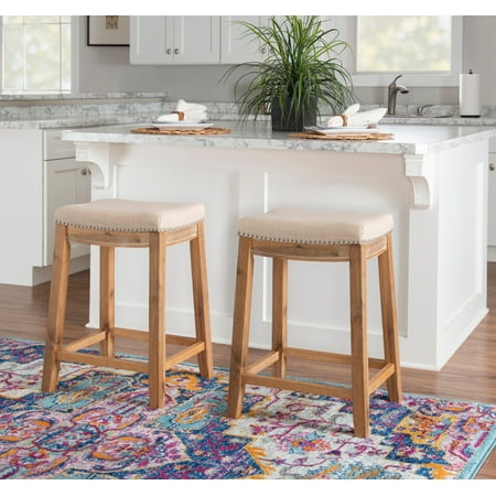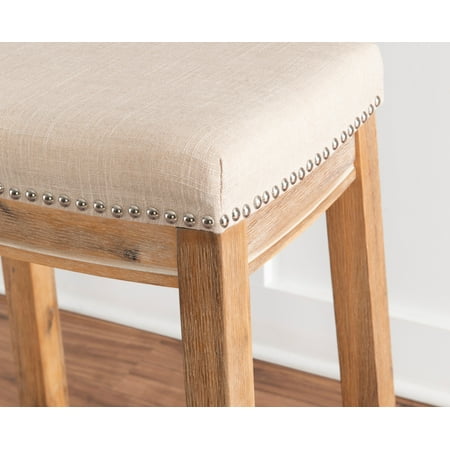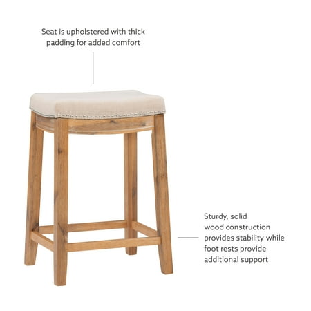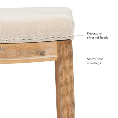 Bring warmth, comfort, and refined style to your kitchen island or home bar with the Linon Claridge 26" Backless Counter Stool. Designed to blend seamlessly into farmhouse, transitional, or classic interiors, this stool features a contoured saddle seat upholstered in soft beige linen for a luxe yet inviting feel. Silver nailhead trim traces the edges with a touch of vintage flair, offering an eye-catching detail that elevates the overall design. The natural wood finish on the solid acacia frame highlights the unique grain patterns, lending rustic charm and timeless character to any setting. Built with both beauty and durability in mind, this backless stool offers exceptional comfort and reliable support with a weight capacity of up to 350 lbs. A thoughtfully integrated footrest adds ergonomic ease, while the 26.5" seat height ensures a perfect fit for countertops and islands between 35" and 39" tall. Its compact, tuck-away design helps maximize floor space—ideal for smaller kitchens or open-concept layouts. Whether you're enjoying your morning coffee or entertaining guests, the Claridge stool delivers sophisticated comfort that lasts.