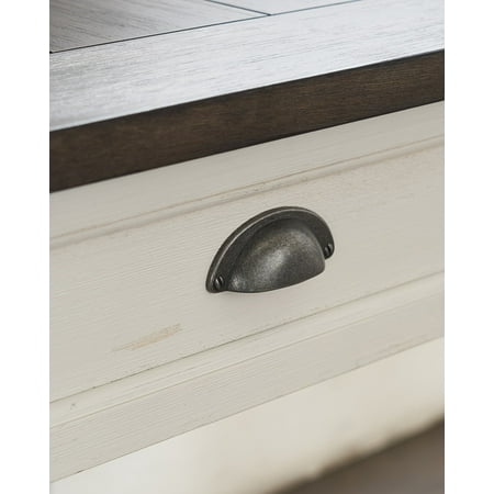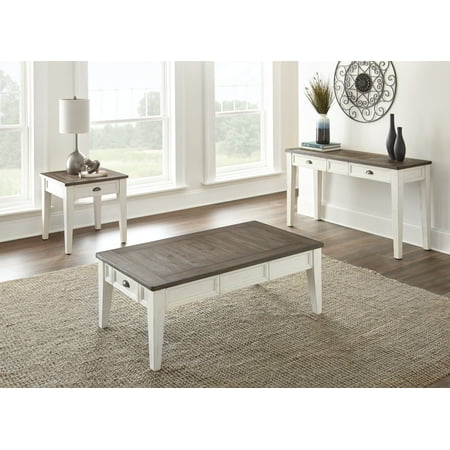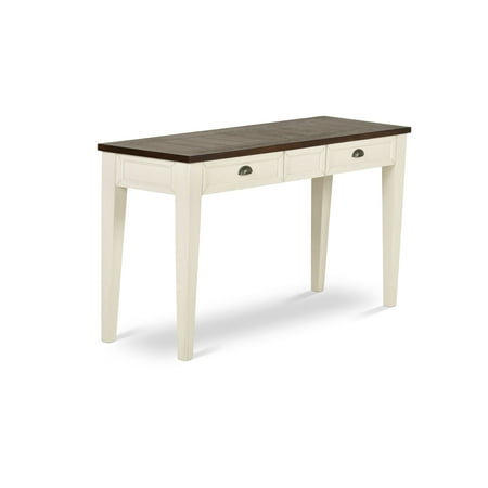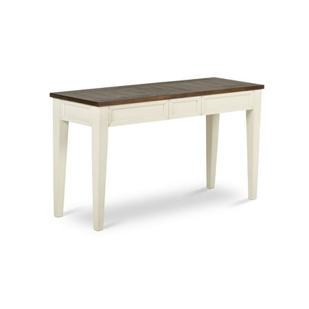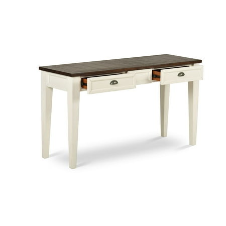 The farmhouse-inspired design of the Cayla Sofa Table will add charm and sophistication to your space. Crafted of durable hardwood solids and mango veneers in a two-tone finish with antiqued white base and dark oak finish top, the sofa table also features two spacious drawers for storage. The picture frame apron, tapered legs and cup drawer pulls complete the vintage look for your home. Features: Finish: Antique White and Dark Oak Material: Hardwood solids, Acacia Veneers Two drawers Picture frame apron Tapered legs Planked top design Specifications: Product Dimensions: 30'' H x 18'' W x 54'' D Product Weight: 60 lbs