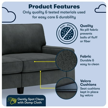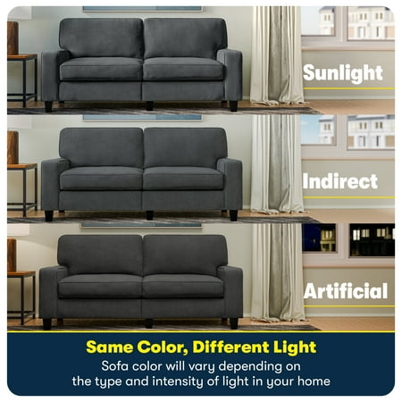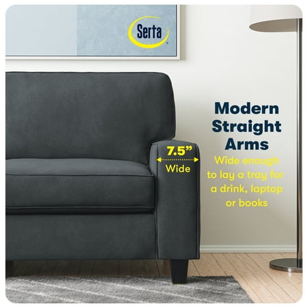 Whether you're furnishing your first home or seeking a space-saving solution for your existing space, Serta delivers. Our conveniently packaged sofas arrive directly at your door in one carton, and they provide the perfect blend of style and comfort you've come to expect from Serta. Don't let living in a modestly sized apartment, or being on a managed budget, be the limiting factors to creating a welcoming home. The Serta Palisades collection is designed specifically for smaller living spaces, offering 61", 73" and 78" length options. With a seat depth of 20.5" you can still relax comfortably without the sofa taking up too much space. However, this means the sofa's proportions are better-suited for users under 6 feet tall. The unopened box will fit any doorway, hall, stairwell, or elevator. Once in your home, it will thrive in smaller living rooms or home offices, but is a versatile choice for dorms, kid’s rooms, den, and family rooms. Plus, its low-profile will make any smaller space feel open and airy, giving the freedom to mix and match with other furniture pieces. This inviting sofa features clean lines and track arms for a timeless look. Upholstered in an anti-pilling polyester fabric or durable bonded leather, the Palisades is easy to care for and spills are simple to clean. 16 color options are available to complement your décor. Please note that the actual color may differ slightly from what appears online depending on the amount of light and the positioning of the sofa in any space. Soft pillow backs, generously filled with soft fibers, rest against a backrest with structured webbing to keep things comfortable and supportive. The seat cushions are filled with high-density, non-recycled Serta quality foam, which cover individually wrapped pocket coils for a supportive core and semi-plush sit. Welcome the Serta Palisades Sofa into your home for modern style and comfort with space-saving functionality. Lounging or relaxing has never been so convenient. Features: SPACE-SAVING DESIGN: Its compact size and low-profile (73" wide x 33" deep x 36" high) make this two-seater couch a great choice for smaller apartments or lofts, living rooms, or home offices. Fits all doorways, halls, stairs or elevators. Better-suited for users under 6ft tall. MODERN CLASSIC: Combines modern and minimalist design with track arms for a sleek and streamlined look. Upholstered in a no-pill polyester fabric or smooth bonded leather with piped edges for a tailored finish in 16 color options. SIT BACK & RELAX: The loose pillow backs are generously filled with soft fibers and supported by structured webbing within the backrest for comfort and support. The pocket coil seat cushions filled with high-density foam provide a semi-plush sit and have removable covers for effortless cleaning. SERTA FOAM & BUILD: Made of a solid wood frame fitted with sinuous springs for extra support and sturdy solid wood legs that can handle up to 500 lbs. All Serta sofas use quality, non-recycled foam for breathability and safety. EASY ASSEMBLY: Simple and quick assembly with hardware kit included. We offer USA Customer Support. Specifications: Product Weight: 74.96