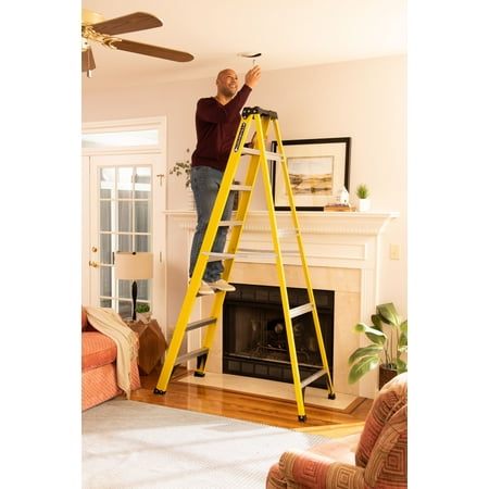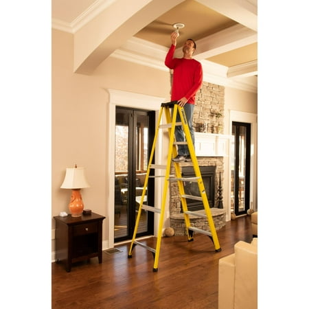 This non-conductive Louisville Ladder 8' Fiberglass Step Ladder is essential for tasks that are related to electrical maintenance, indoors and out, at home or at the jobsite. It can be used to change light bulbs or access roofing and much more. This maintenance ladder has a ProTop with multiple slots for holding power and hand tools, paint cans and other items. It also comes with a paint pail hook and has slip-resistant rubber feet and deep, slip-resistant aluminum steps, which are riveted in channels for increased stability. An additional pinch-resistant spreader brace ensures that this Louisville Ladder 8' Fiberglass Step Ladder stays in place when you are climbing it. It is easy to use and can be stored in a garage or up against the house when the job is finished. It is ANSI Type 1 rated to hold a maximum of 250 lbs of tools and people combined.
