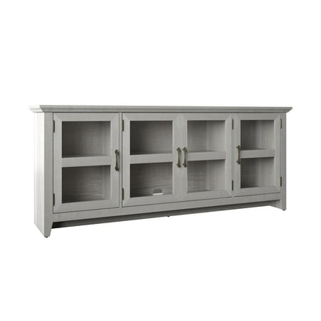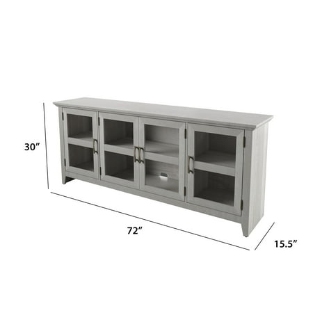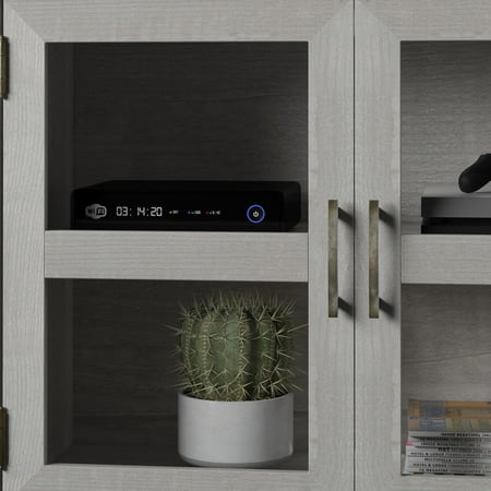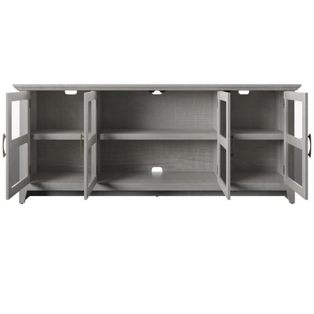 This TV stand features spacious storage and beautiful, traditional style to complete your living room, family room, or den. It securely holds most flat screen TVs up to 80 inches and 90 pounds so that you can enjoy your favorite movies and shows on a big screen in the comfort of your own home. Each side cabinet and the center double door cabinet have framed, tempered glass doors that easily allow remote control signal to pass through to electronics. Within each cabinet is one adjustable shelf for flexible storage of all your AV components and living room must-haves. Back panel cutouts manage cords and prevent tangles while also giving your electronics ventilation.