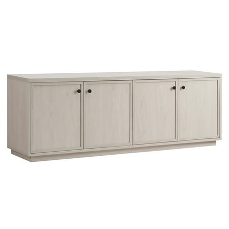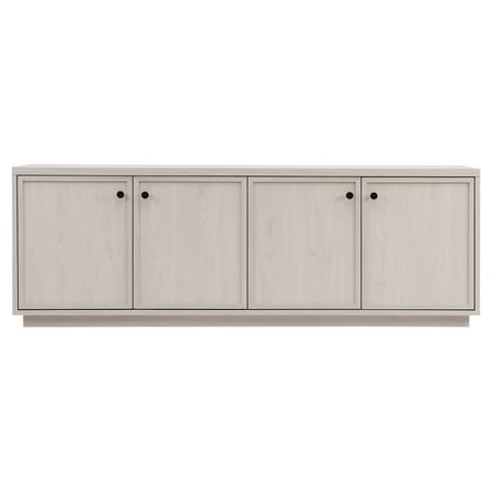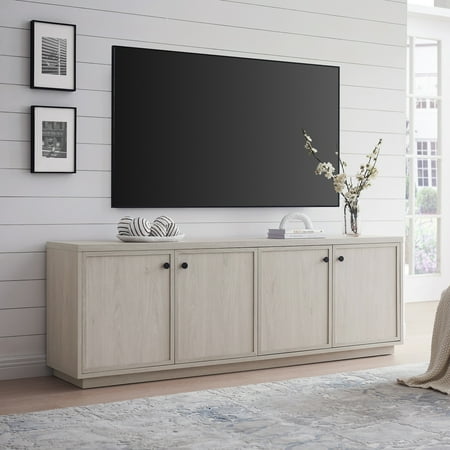 Combine functionality and classic transitional design with this modern TV stand. Its rich wood tone creates a warm neutral palette that will blend seamlessly into any color scheme, while its minalist shaker styling pairs perfectly with the existing design inspiration of your living room, den, or game room. This solid-backed stand features two large enclosed cabinets with black pull knobs on a sturdy plinth-style base. Cable management cut-outs and adjustable inner shelves help keep your media storage and consoles organized, and adjustable leveling feet and door hinges ensure everything sits just right. Features: A transitional design accommodates TVs up to 75" for your entertaining space. Constructed of sturdy MDF materials in an alder white finish. Features four doors with enclosed cabinets and 4 shelves for ample storage. The top has a weight capacity of 75 lbs. Middle shelves can support 20 lbs; lower shelves can hold 50 lbs. Clean with a soft, dry cloth; no harsh chemicals or abrasive cleaning materials. Features easy assembly. Specifications: Product Dimensions: 69.63"W x 15.5"D x 24"H Product Weight: 91.7 lbs Color/Finish: Alder White