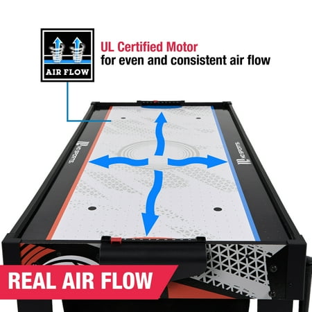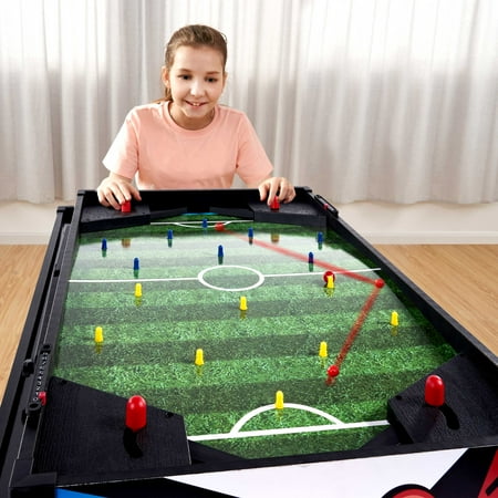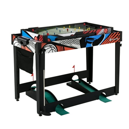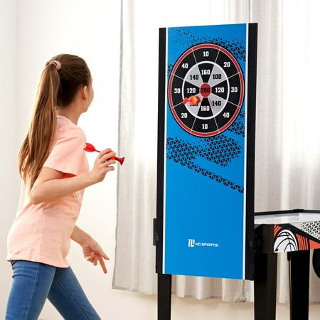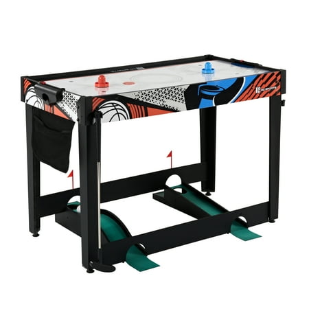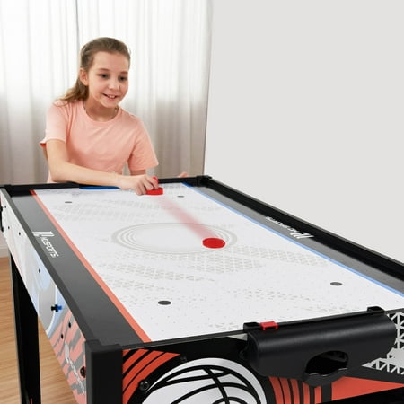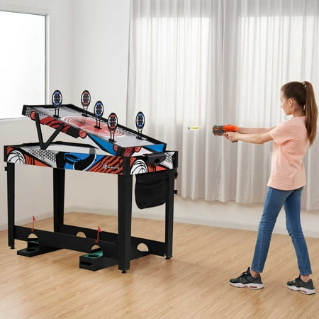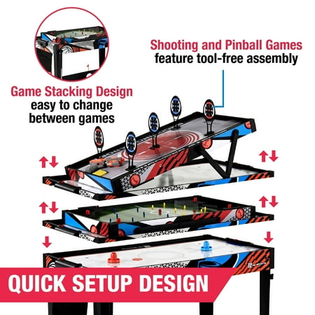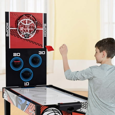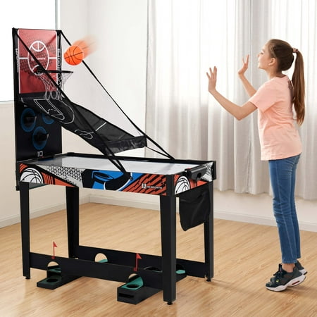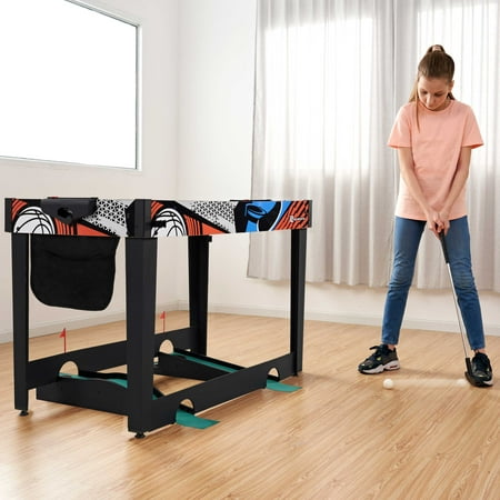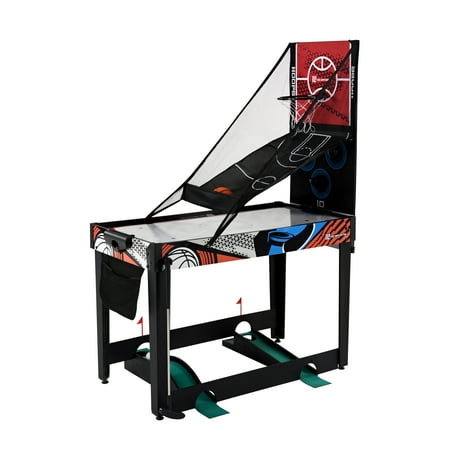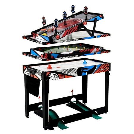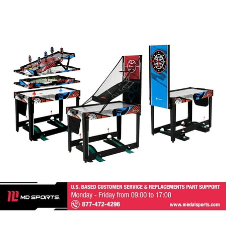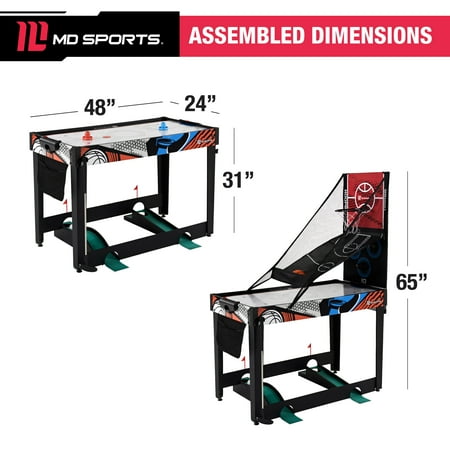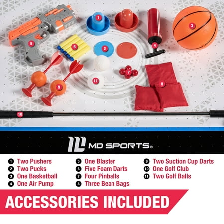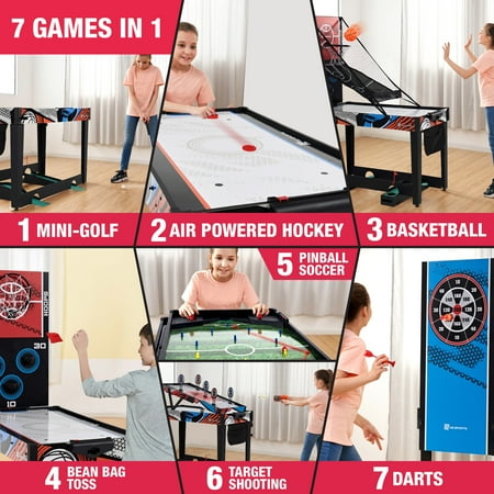 48-inch Multi-Player 7 Games-in-1 Combo Table, by MD Sports, has multiple great game options all in one for kids of all ages. This great game table provides many game options basketball, pinball soccer, bean bag toss, darts, mini-golf, target shooting, air-powered hockey table, and all playing accessories are included to play all the games. Easily change between the seven-game options with the game stacking design and safety locking system. The assembled size of this table is 48" L x 24" W x 31" H, and it is great for game rooms, bedrooms, and basements. Everyone will enjoy these seven-game options with some friendly competition, which provides hours of fun and entertainment for all ages.