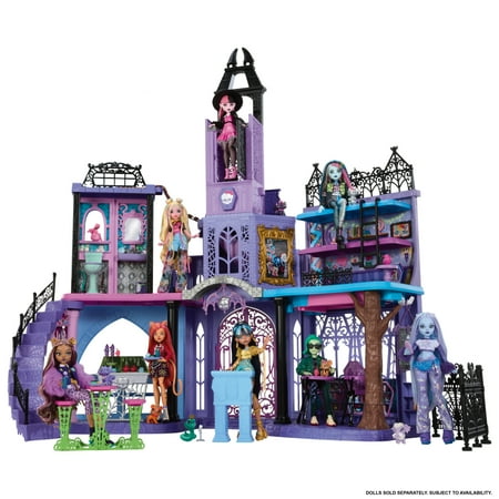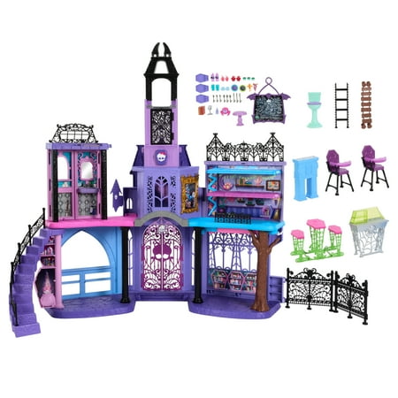 The Monster High Haunted High School doll house is the skulltimate place for everyone's favorite boos to fang out! It has over 7 play areas like a dorm room, bathroom, creepateria, and classroom, including multiple surprise transformations! Whether hitting the books in study howl or brewing up some fun in the potion corner, there are so many scary fun stories to tell with the Haunted High School. It makes an unforgettable gift for kids ages 4 years old and up! Dolls not included. Colors and decorations may vary.