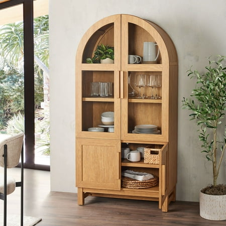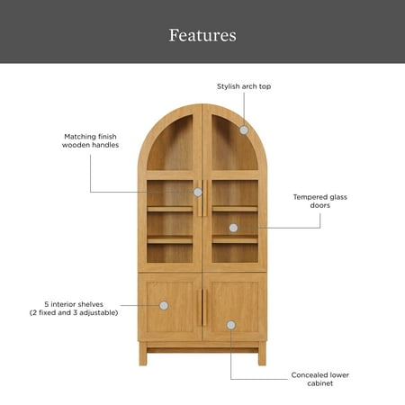 The Better Homes & Gardens Juliet Kitchen Rounded Arch Cabinet is a stylish and functional addition to any dining space, offering a perfect blend of elegance and practicality. The upper section of this fashion cabinet features tempered glass doors, allowing you to showcase your cherished dining ware and collectibles with a touch of sophistication. The lower portion of this living room storage cabinet provides concealed storage options, allowing you to keep clutter at bay while maintaining a polished look in your dining area. The cabinet's adjustable shelves offer versatility, allowing you to customize the storage space according to your specific needs. Whether it's fine China, glassware, or other dining essentials, the Arched Dining Cabinet provides a secure and organized storage solution. The cabinet doors are attached with soft-closing euro-style hinges. The versatility of this piece is further emphasized by its 3 adjustable and 2 fixed interior shelves, giving you the flexibility to adapt the cabinet to different storage needs. This cabinet is a well-crafted furniture piece that can be used in your kitchen, dining room, living room or any room in your home.