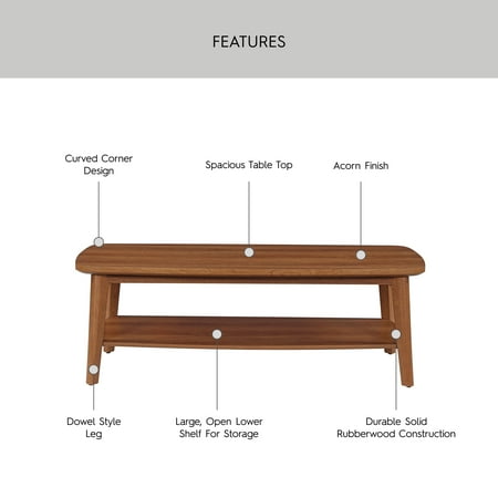 Bring effortless charm and functional style to your space with the Better Homes & Gardens Greyson Coffee Table. Designed with a nod to mid-century modern style, this coffee table instantly warms up any living room, lounge, or family space with its rich acorn finish and subtly curved details. Crafted from solid rubberwood, it’s as durable as it is stylish—ready to hold everything from coffee mugs and magazines to board games and your favorite decorative finds. The spacious tabletop gives you plenty of room to spread out (hello, cozy movie nights!), while the large open lower shelf is perfect for storing baskets, books, or those extra throw blankets you always need nearby. With rounded edges on the legs and softly curved corners, the Greyson Coffee Table feels approachable, family-friendly, and thoughtfully designed for everyday life. Whether you’re refreshing your room or finishing off a new setup, this piece is a timeless staple that blends function with just the right amount of flair.